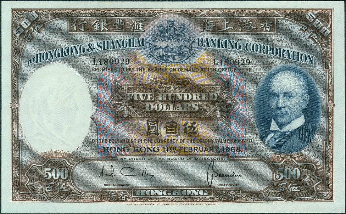 Hong Kong and Shanghai Banking Corporation, $500 (3), 11 February 1968, serial numbers L 180928/929/930, brown and multicoloured, Sir Thomas Jackson at right, arms at centre, value at centre and at each corner, two printed signatures below, reverse blue and white, bank building at centre, female head (Ceres) veiled at left, value at each corner