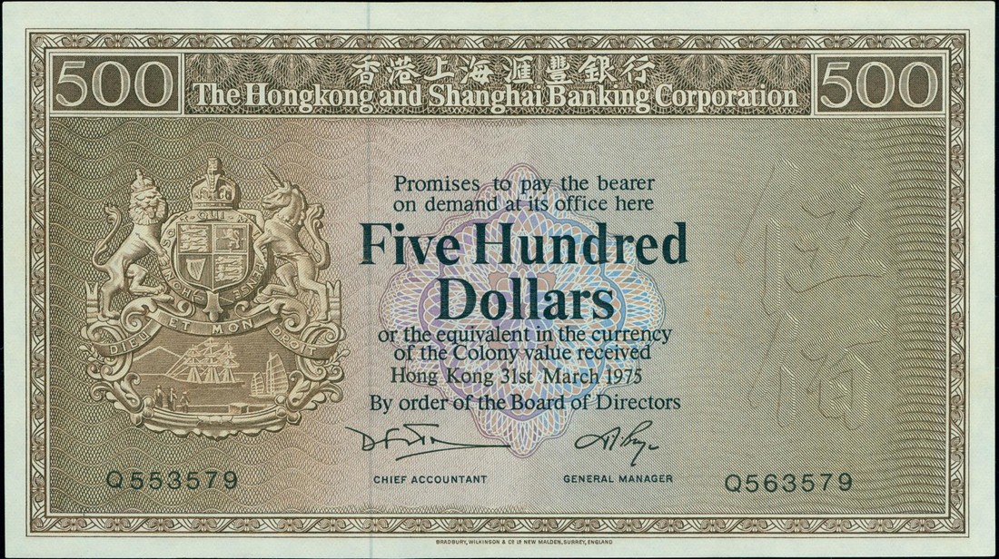 Hong Kong and Shanghai Banking Corporation, $500, 31 March 1975, error mismatched serial numbers Q553579 and Q563579, brown, coat of arms at left, 'five hundred' in Chinese characters at right, reverse brown, lion overlooking the HSBC building,