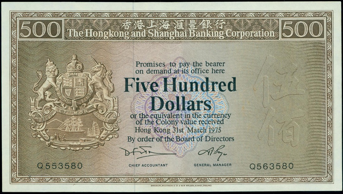 Hong Kong and Shanghai Banking Corporation, $500, 31 March 1975, error mismatched serial numbers Q553580 and Q563580, brown, coat of arms at left, 'five hundred' in Chinese characters at right, reverse brown, lion overlooking the HSBC building,
