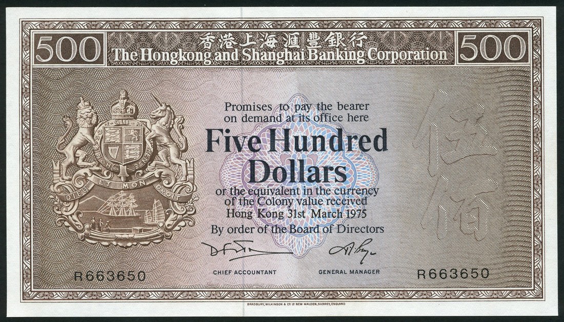 Hong Kong and Shanghai Banking Corporation, $500, 31 March 1975, serial number R 663650, brown and lilac, arms at left, reverse brown, lion at right