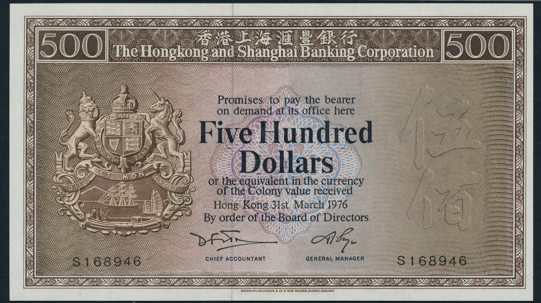 Hong Kong and Shanghai Banking Corporation, 500 dollars, 1976, serial number S168946, brown on multicolour underprint,