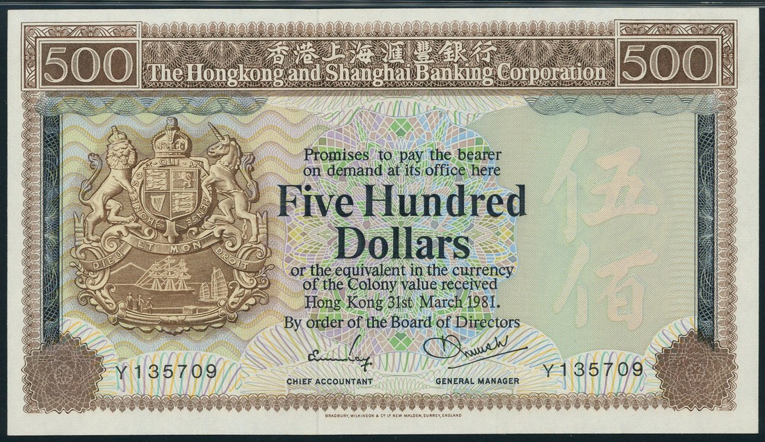Hong Kong and Shanghai Banking Corporation, $500, 31 March 1981, serial number Y 135709, brown and multicoloured, arms at left, reverse brown, lion at right