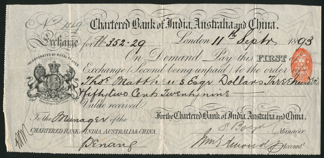 Chartered Bank of India, Australia & China, a bill of exchange for $352 - 29 cents, drawn London 11 September 1896, black & white, addressed to the Penang branch, royal arms at left,