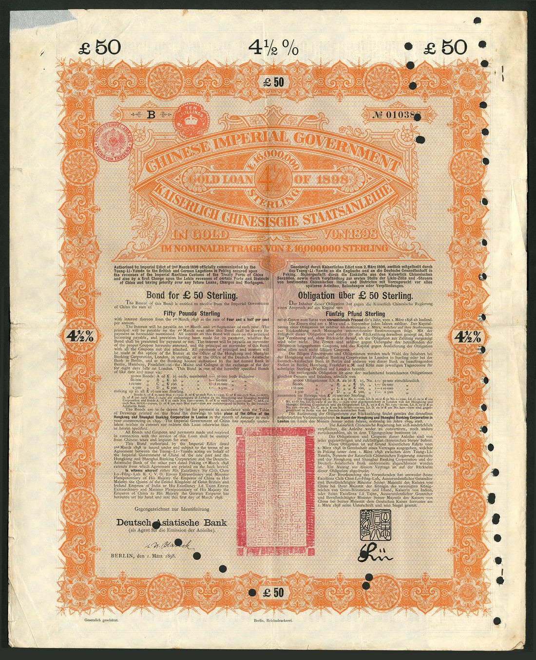 1898 4½% Gold Loan, a group of bonds for £50, issued by the Deutsch-Asiatische Bank, large format, orange and black, with coupons, all hole cancelled, condition varies, fine to very fine. (15)