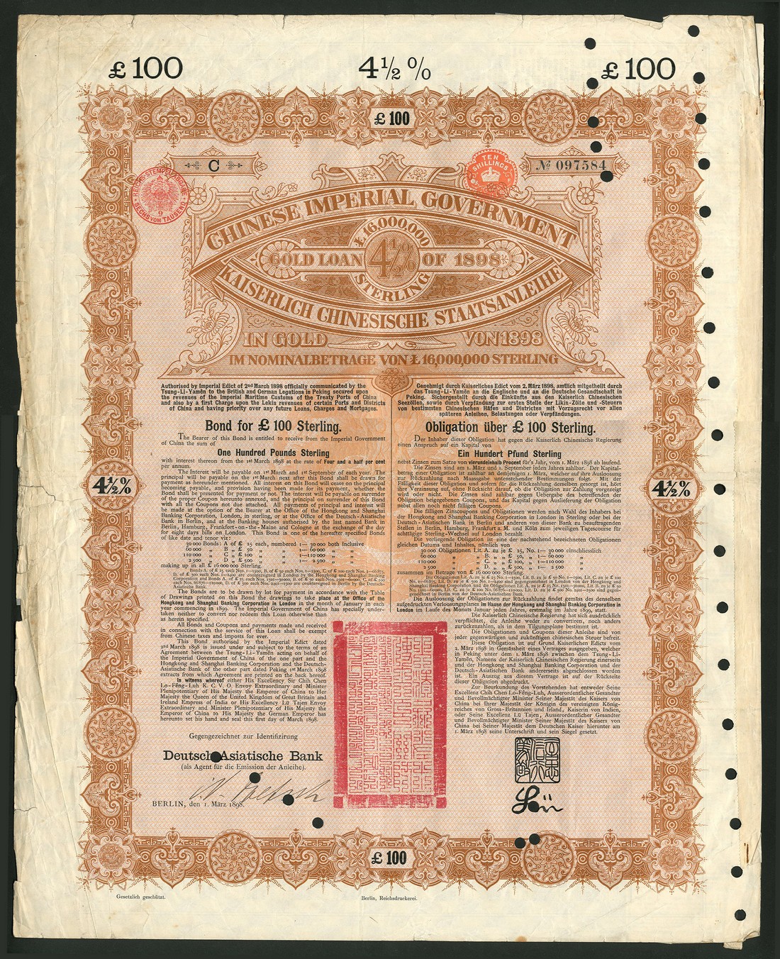 1898 4½% Gold Loan, a group of bonds for £100, issued by the Deutsch-Asiatische Bank, large format, brown and black, with coupons, all hole cancelled, condition varies, fine to very fine. (15)