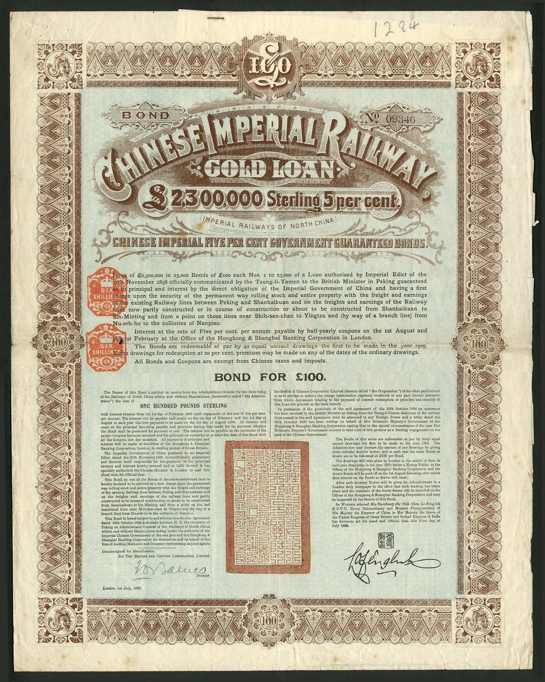 Chinese Imperial Railway 5% Gold Loan, 1899, bond for £100, no.09346, very large format piece with ornate border, text all in English, brown with pale blue underprint, with coupons, tiny hole in centre but about very fine.