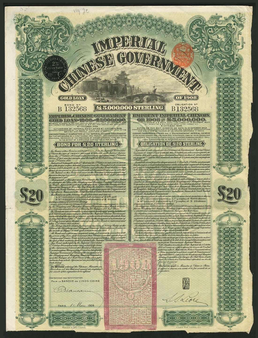 1908 5% Gold Loan, bond for £20, countersigned by Banque de L'Indo-Chine, no.B132568, ornate border with scrollwork at top corners, vignette at top depicting walled city, printed by Waterlow & Sons, no coupons as usual, edge nick at left, near extremely fine.