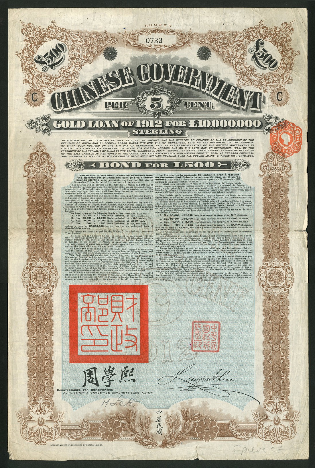 1912 5% Gold 'Crisp' Laon, £500 bond no.733, large format piece with ornate border, brown with blue underprint, with coupons, split at centre fold, small tear bottom edge, fine to very fine