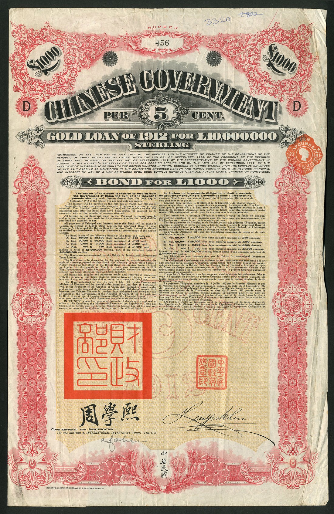 1912 5% Gold 'Crisp' Laon, £1000 bond no.456, large format piece with ornate border, red with yellow underprint, with coupons, creased at right, annotation in top margin, fine to very fine.
