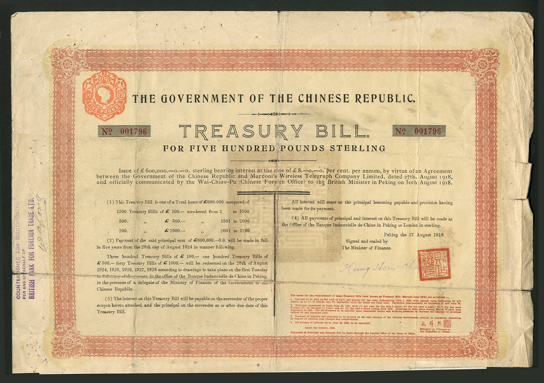 1918, 8% 'Marconi' Treasury Bill, bond for £500, no.001796, ornate border, red and black with yellow underprint, edge tears at right, heavy creasing, fine.