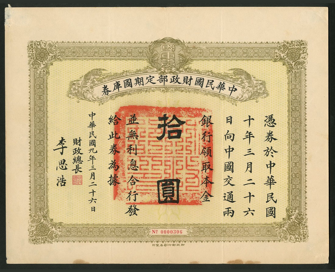1920 Short Term Treasury Bills, 10 yuan, 26 March 1920, no.0000386, redeemable in 12 months, ornate borders, green and black, red 'chop' in centre, very fine but light stain in bottom margin.