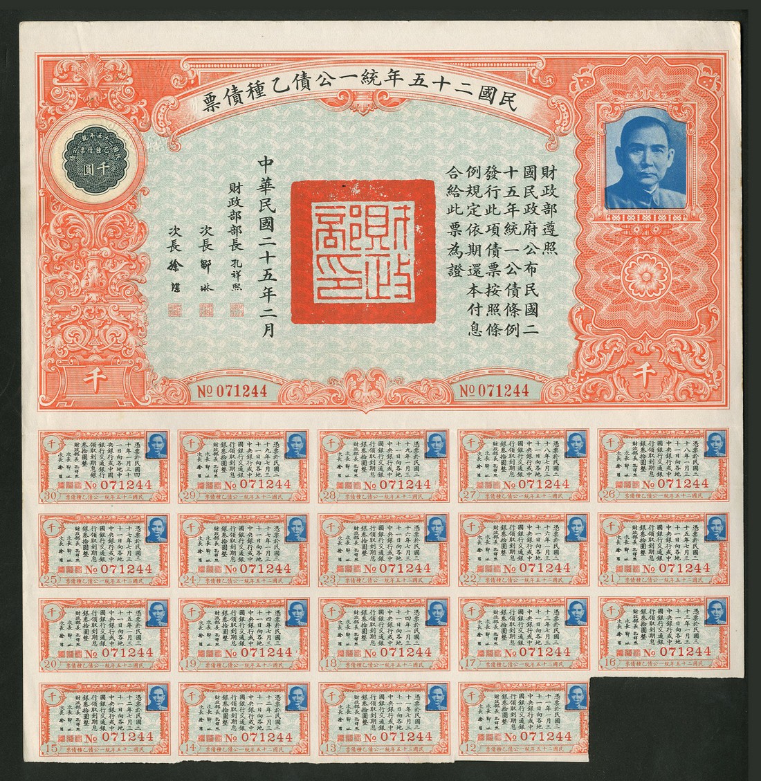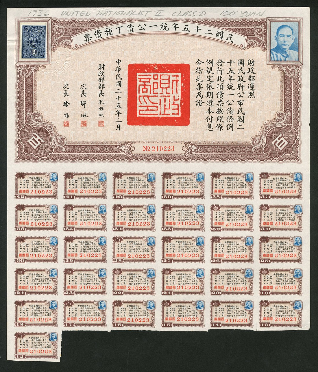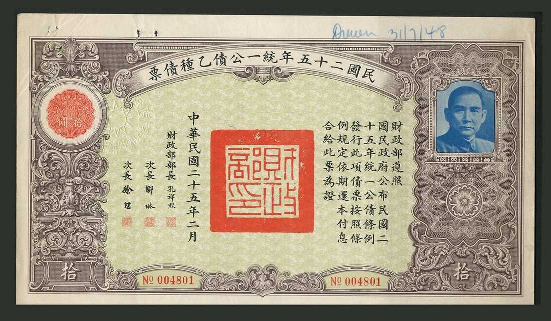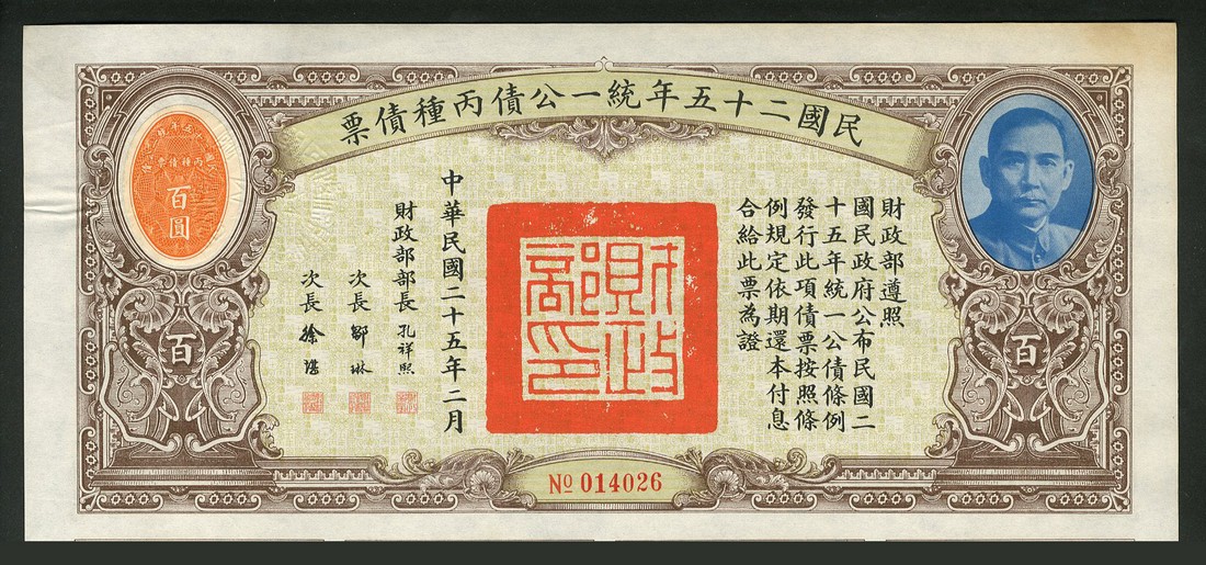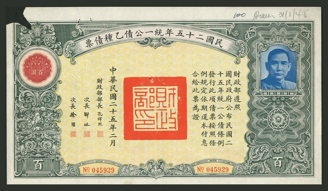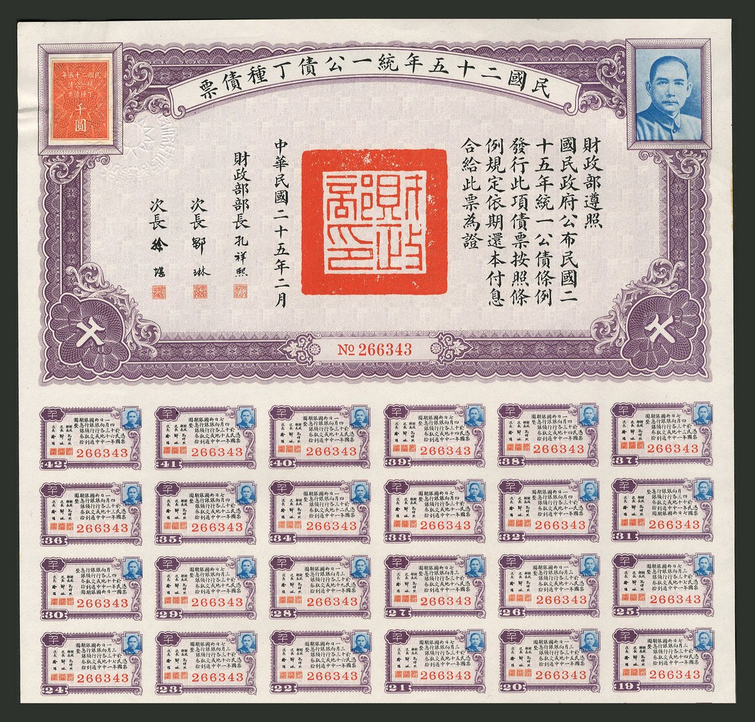 1936 United Nationalist Loan, a group of seven bonds comprising 1st issue, 100 yuan, 2nd issue, 10, 100 and 1000 yuan, 3rd issue, 100 yuan and 4th issue, 100 yuan and 1000 yuan, all with vignette of Sun Yat Sen at right, various colours and styles, all with coupons, the second from last with damaged top left coner otherwise very fine to extremely fine. (7)