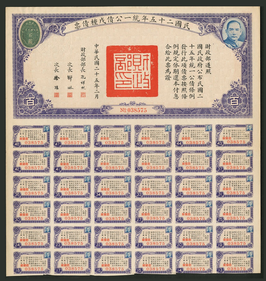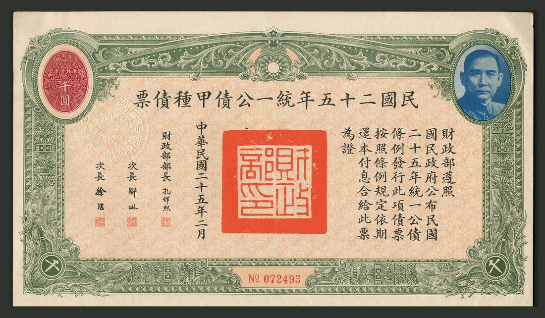 1936 United Nationalist Loan, a group of 3 bonds, 1st series, 1000 yuan, 4th series, 1000 yuan and 5th series, 100 yuan, all with head of Sun Yat sen at top right, various colours, text all in Chinese, with coupons, extremely fine (3)