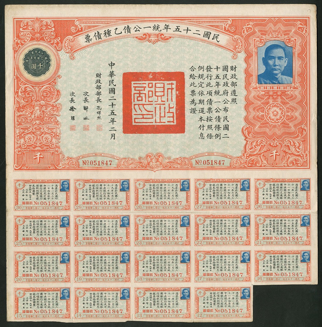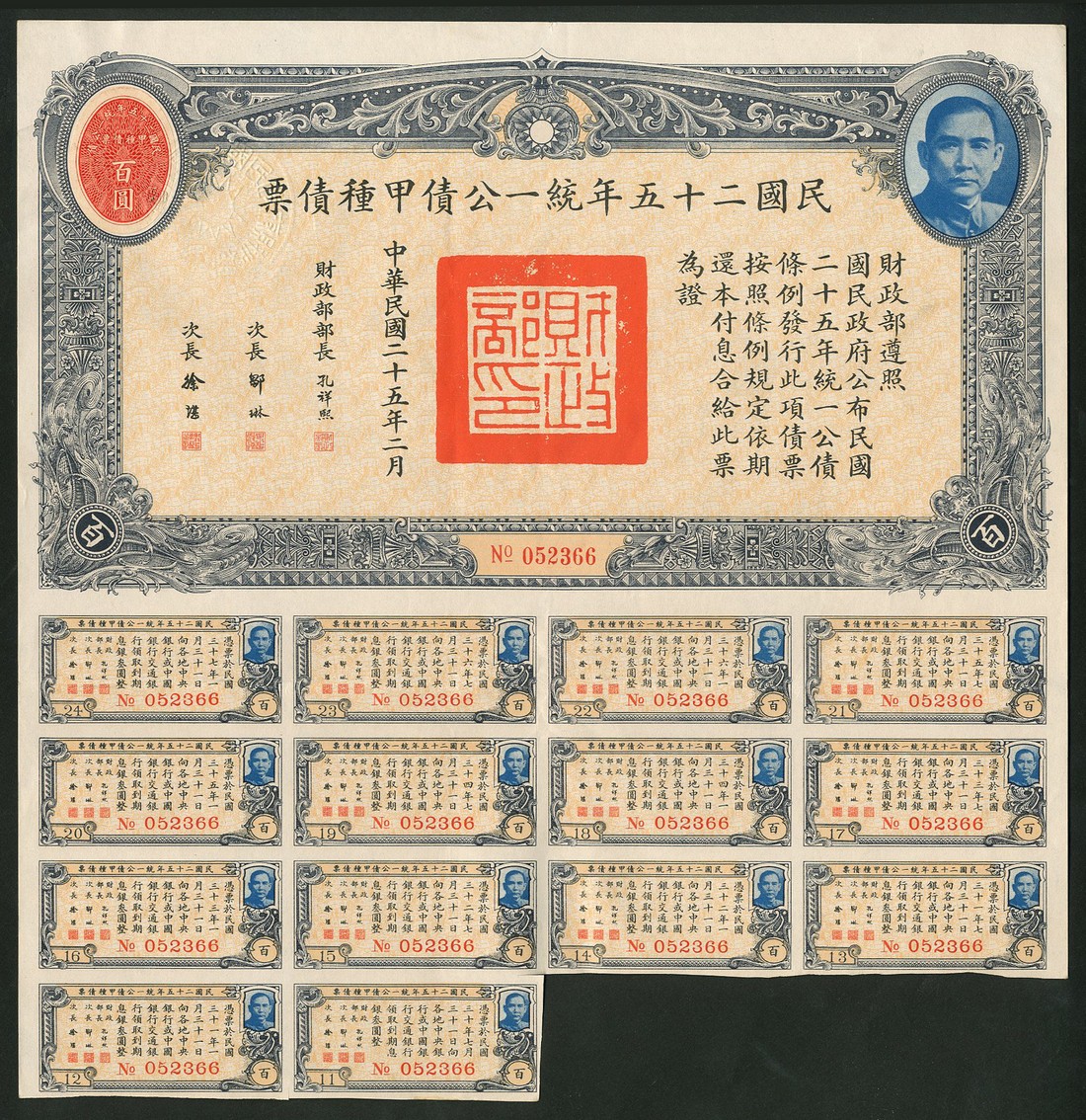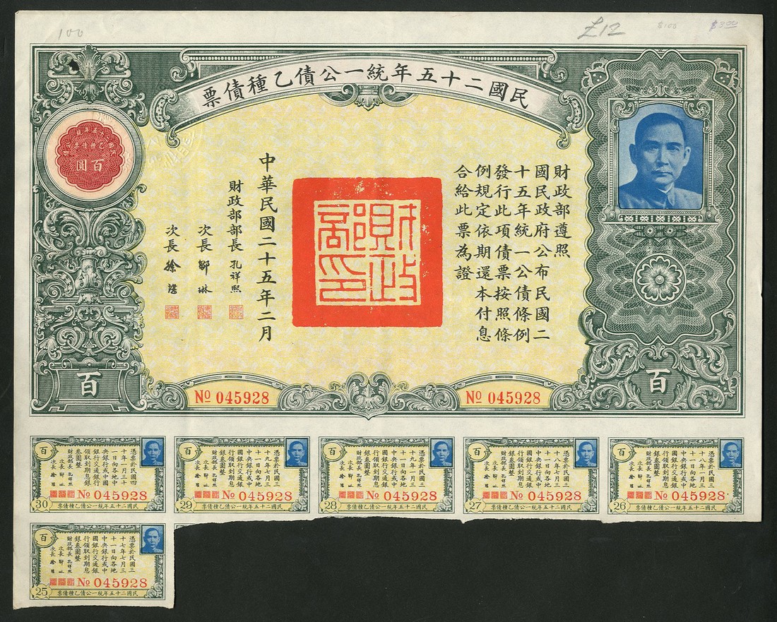 1936 United Nationalist Loan, a group of bonds comprising 1st issue, 100 yuan, 2nd series, 10 yuan, 100 yuan and 1000 yuan, 3rd series, 100 yuan and 4th series, 100 yuan and 1000 yuan, all with vignette of Sun Yat Sen, with coupons, very fine to extremely fine. (7)