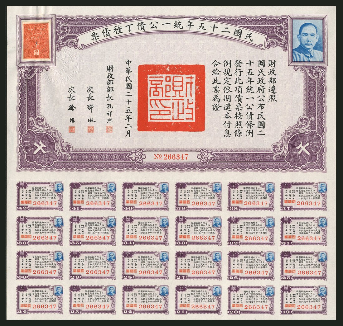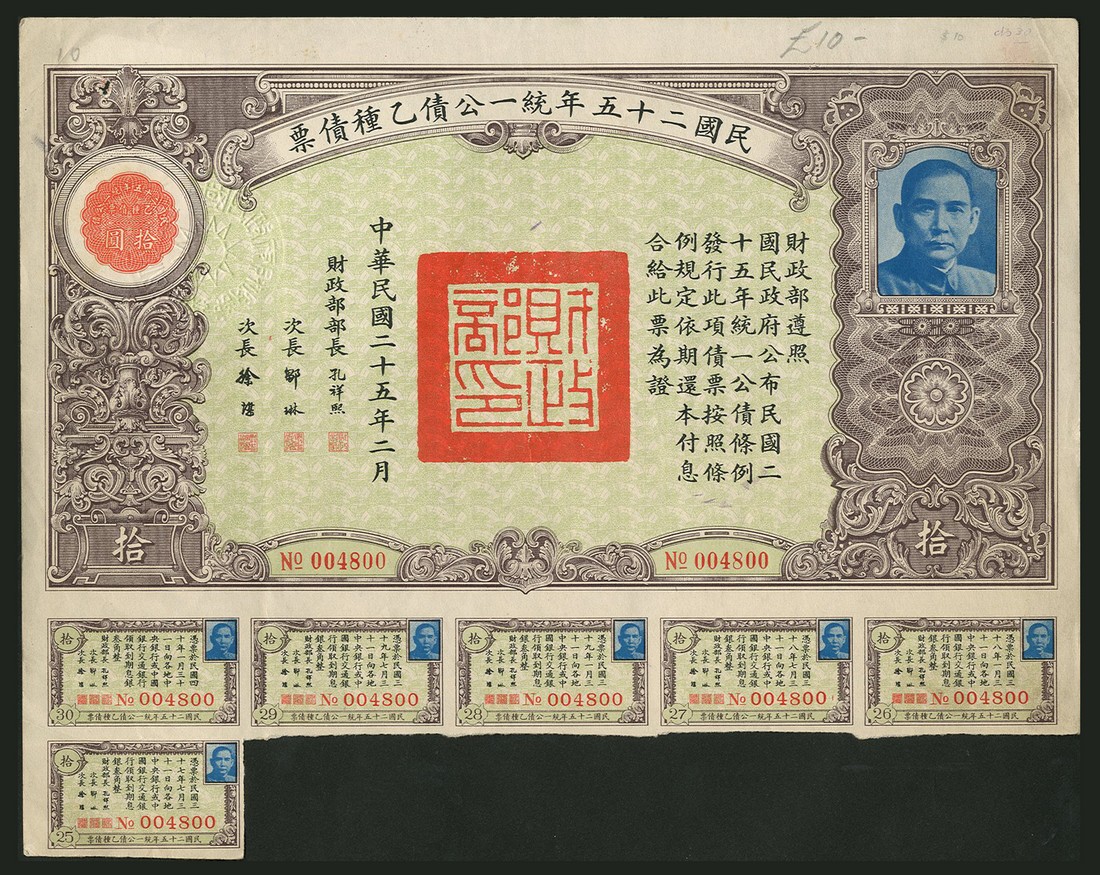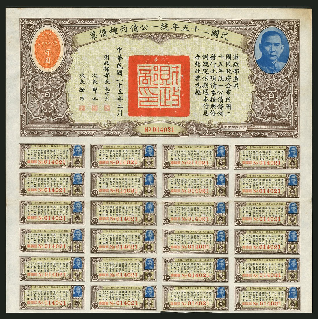 1936 United Nationalist Loan, a group of bonds comprising 1st issue, 100 yuan, 2nd series, 10 yuan, 100 yuan and 1000 yuan, 3rd series, 100 yuan and 4th series, 100 yuan and 1000 yuan, all with vignette of Sun Yat Sen, with coupons, very fine to extremely fine. (7)