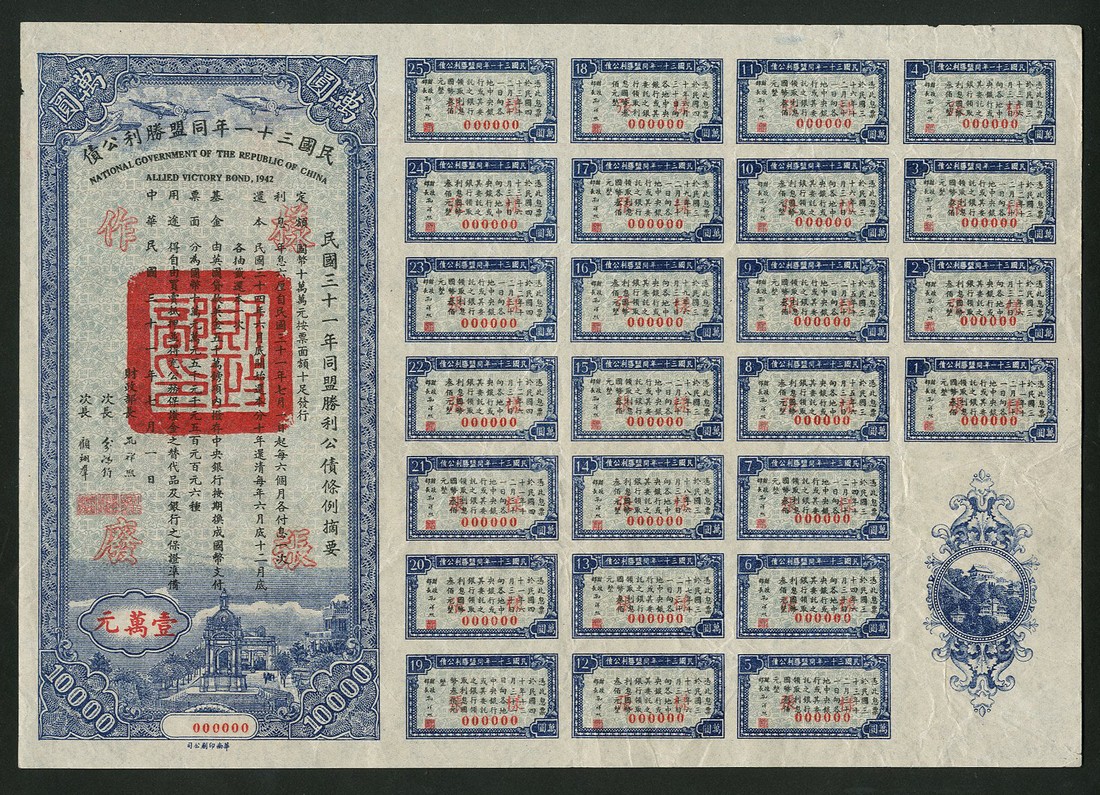1942 Allied Victory Loan, a specimen bond for 10,000 yuan, numbered 000000, small format, aircraft at top, buildings at bottom, blue and red, red chop in centre, with all coupons, near extremely fine.