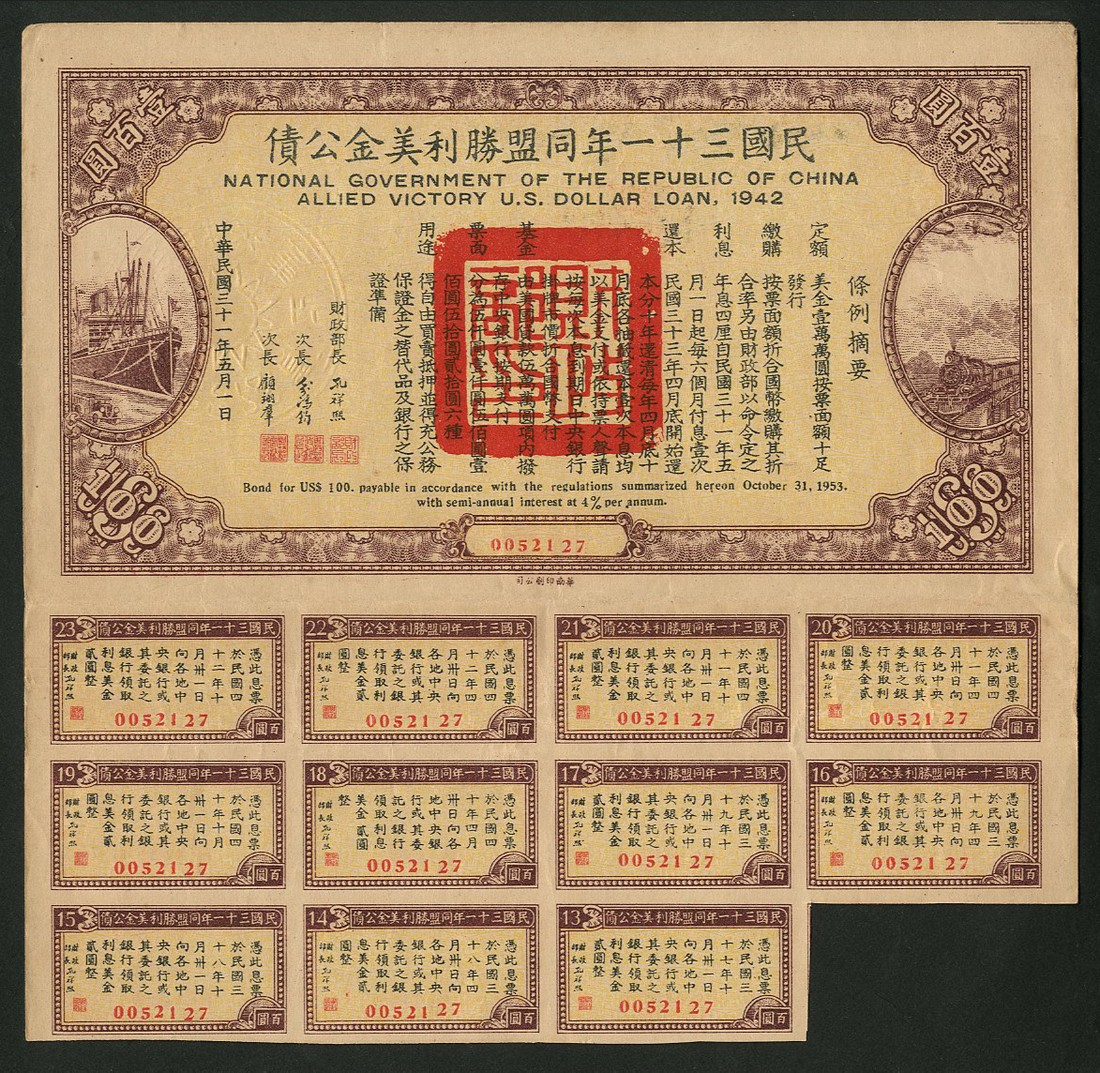 1942 Allied Victory U.S. Dollar Loan, a group of 9 bonds for $100, small format bonds with vignettes of steamship at left and steam train at right, mauve and black, yellow underprint, with coupons, very fine and better. (9)