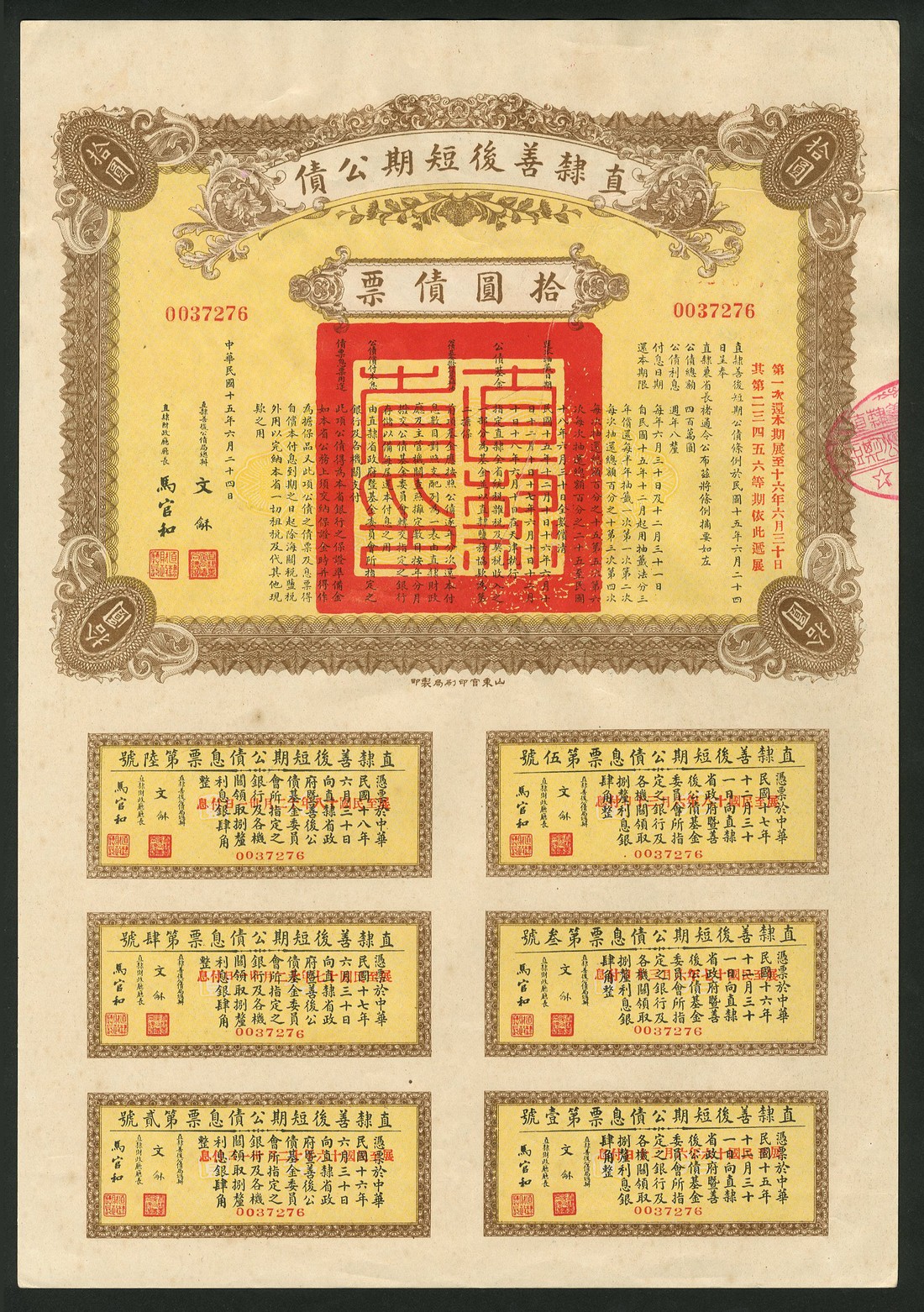 Chihli Province 8% Short Term Rehabilitation Loan, 1926, a group of 3 bonds for 10 dollars, numbers 37274,37276 and 37287, ornate border, brown with yellow underprint, red 'chop' in centre, text in Chinese with English on the reverse, with coupons, all about extremely fine. (3)
