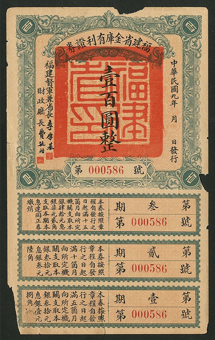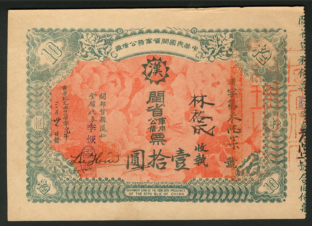 Fukien Province, Military Loan, bond for 10 yuan, 1912, small format, green and red, text in Chinese but with English title only; together with Treasury bond for 100 yuan, 1920, unissued, small format, green and red, with coupons, the last with edge tears and some pieces missing, the first good very fine, both scarce. (2)