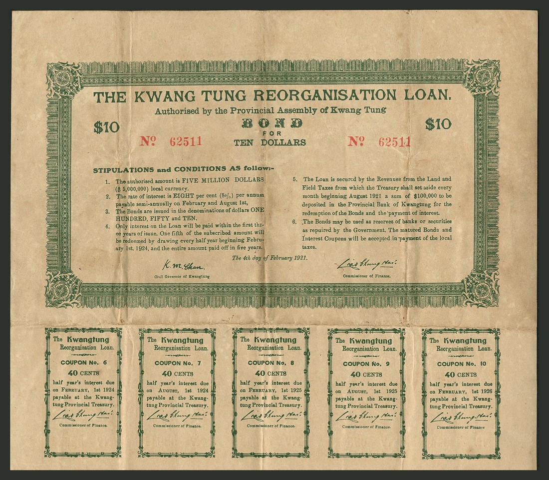 Kwang Tung Province 8% Reorganisation Loan, 1921, bond for 10 dollars, no.62511, ornate border, red, yellow underprint, text in Chinese with English on the reverse, with coupons, folds, about very fine.