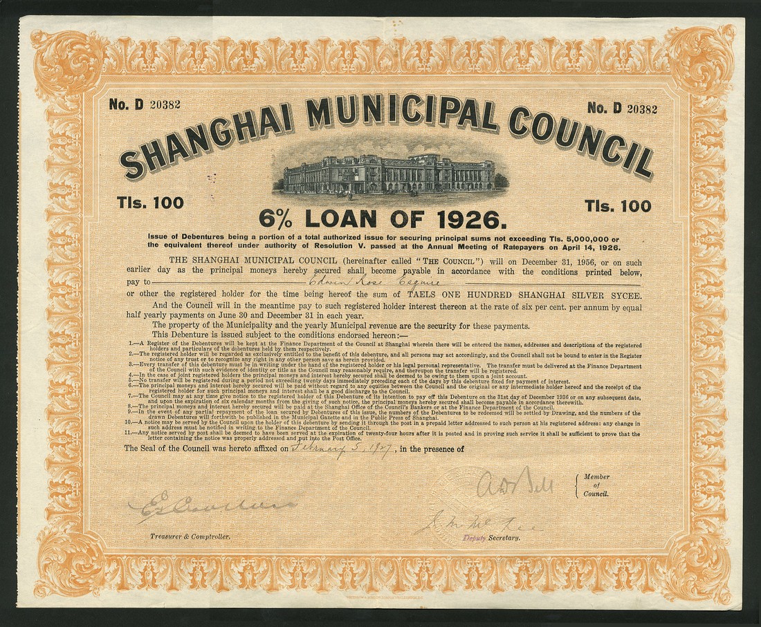 Shanghai Municipal Council, 6% Loan of 1926, debenture for 100 taels, no.D20382, large format piece with Shangahi Council buildings in centre, ornate border, yellow and black, printed by Waterlow & Sons, good very fine.