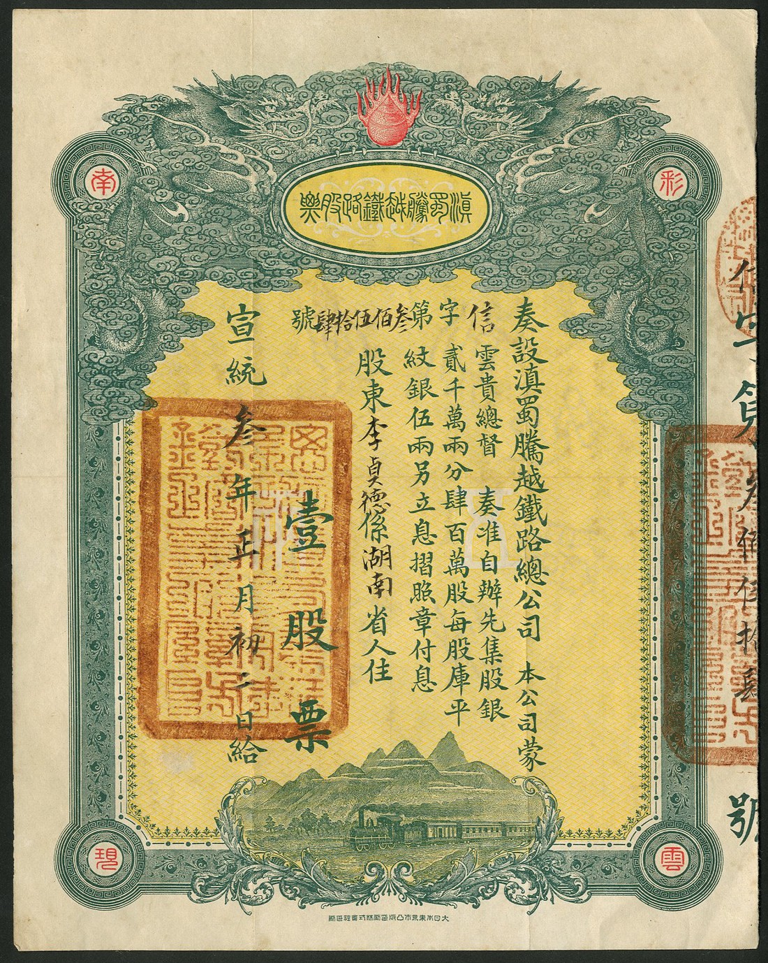 Yunnan Szechuan Railway Company, 1 share of 5 taels, 1911 vignette of steam train at bottom, ornate border with dragons at top, green and red with yellow underprint, very fine and scarce.