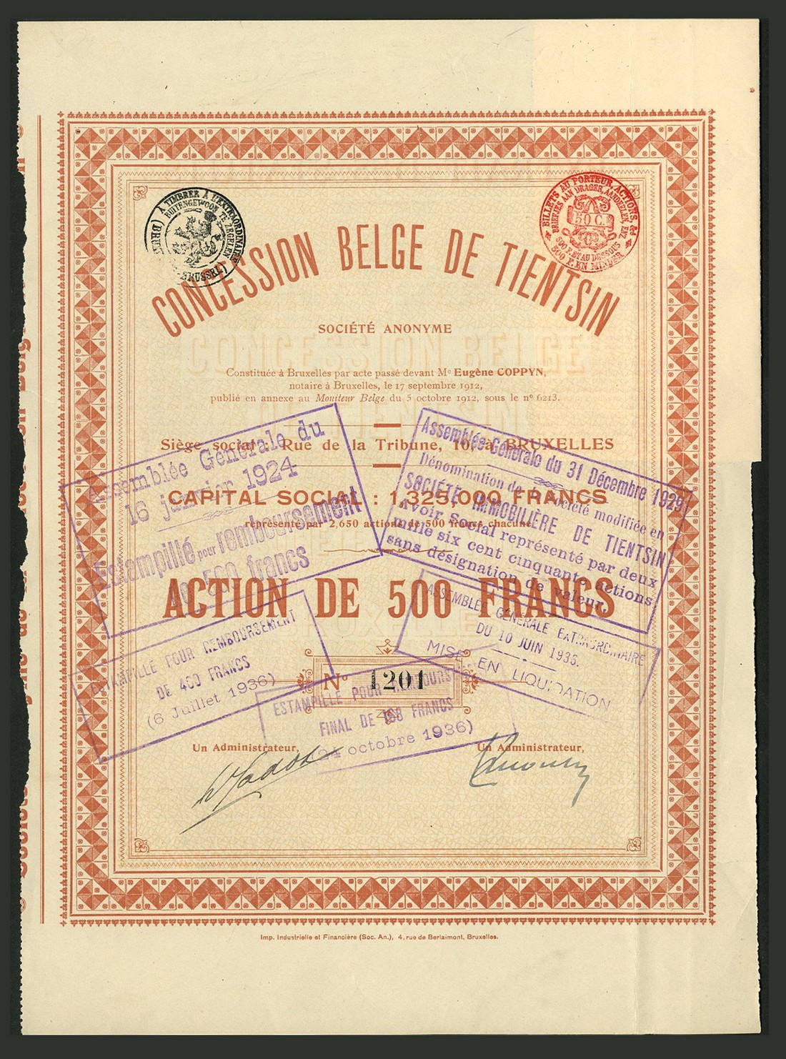 Concession Belge de Tientsin S.A., 500 franc share, Brussels 1912, no.1201, ornate border, orange brown, with coupons, several endorsements on face, uneven left edge with small tear otherwise about extremely fine.