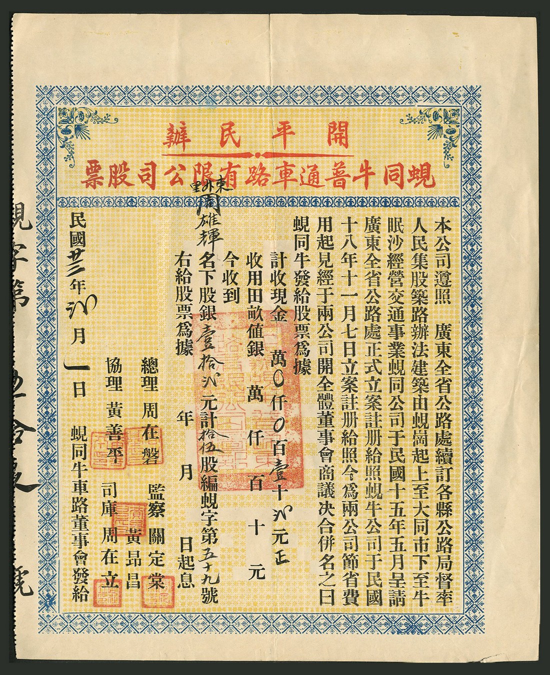 Hin Tung Niu Pu Motor Road Co. Ltd. (Kaiping), $10 share, 1934, ornate border, red, blue and black, text all in Chinese, together with Tai Ti Motor Road Co. Ltd. (Taishan), 75 gold yuan shares, 1949, ornate border, blue and black, text all in Chinese, fine to very fine and scarce. (2)