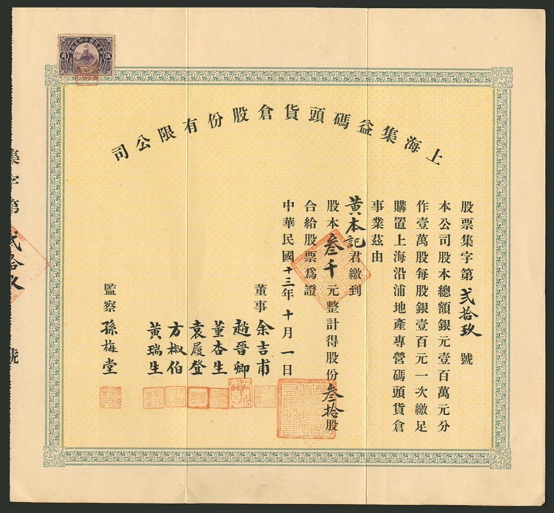 Jee Yee Pier Warehouse Co. Ltd., Shanghai, 100 yuan shares, 1924, ornate border, green and black with yellow underprint, text all in Chinese, adhesive revenue stamp at top, small split at folds, good very fine.