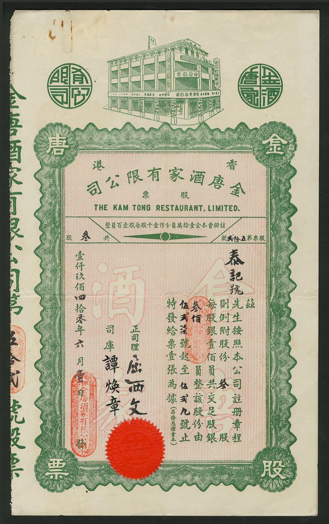 Kam Tong Restaurant Ltd., Hong Kong, 100 yuan shares, 1940, vignette of 3 storey building at top, ornate border, green, red seal, red 'chops', text all in Chinese apart from the company name, rust mark at top edge from paper clip, very fine.