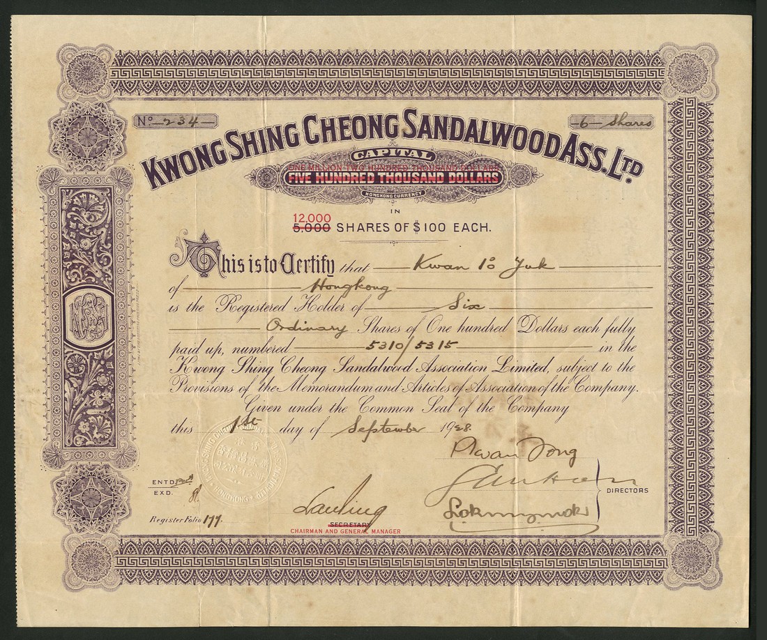 Kwong Shing Cheong Sandalwood Association Ltd., Hong Kong, $100 shares, 19[28], no.234, ornate border, mauve and black, capital increase overprinted in red, English on one side with Chinese on the other, very minor toning, very fine.