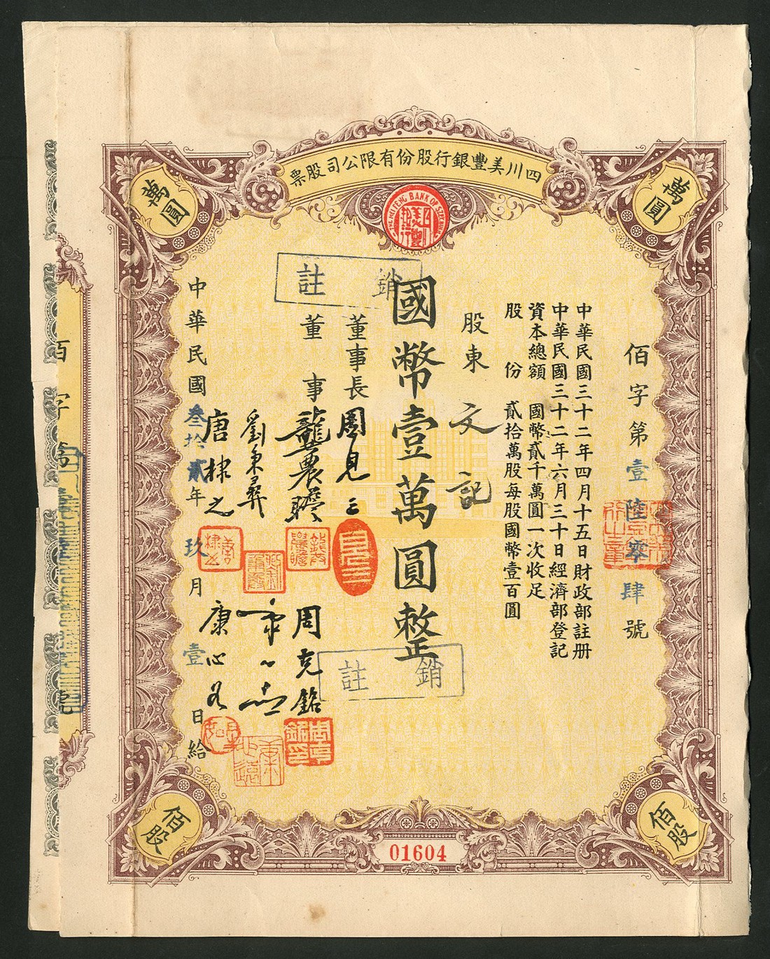 Mei Feng Bank of Szechuan, 100 shares of 100 yuan, 1943, no.01604, underprint of bank building, ornate border, brown and black, with yellow underprint, with coupons, text all in Chinese but Company name in English below Chinese title, very fine.