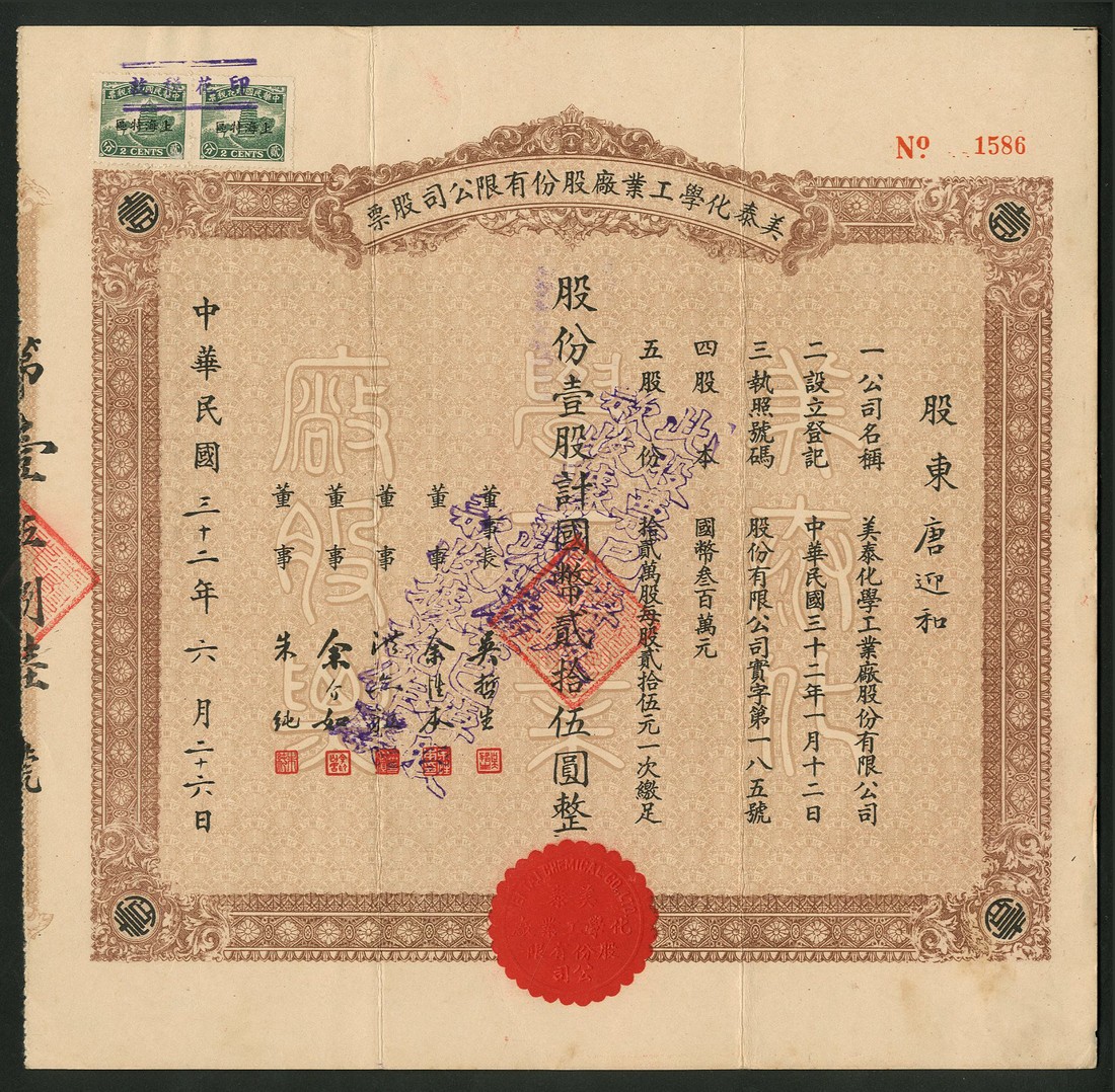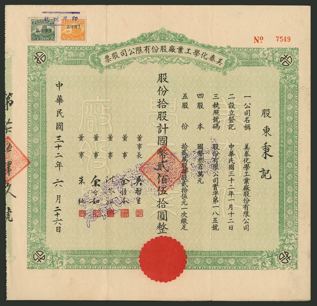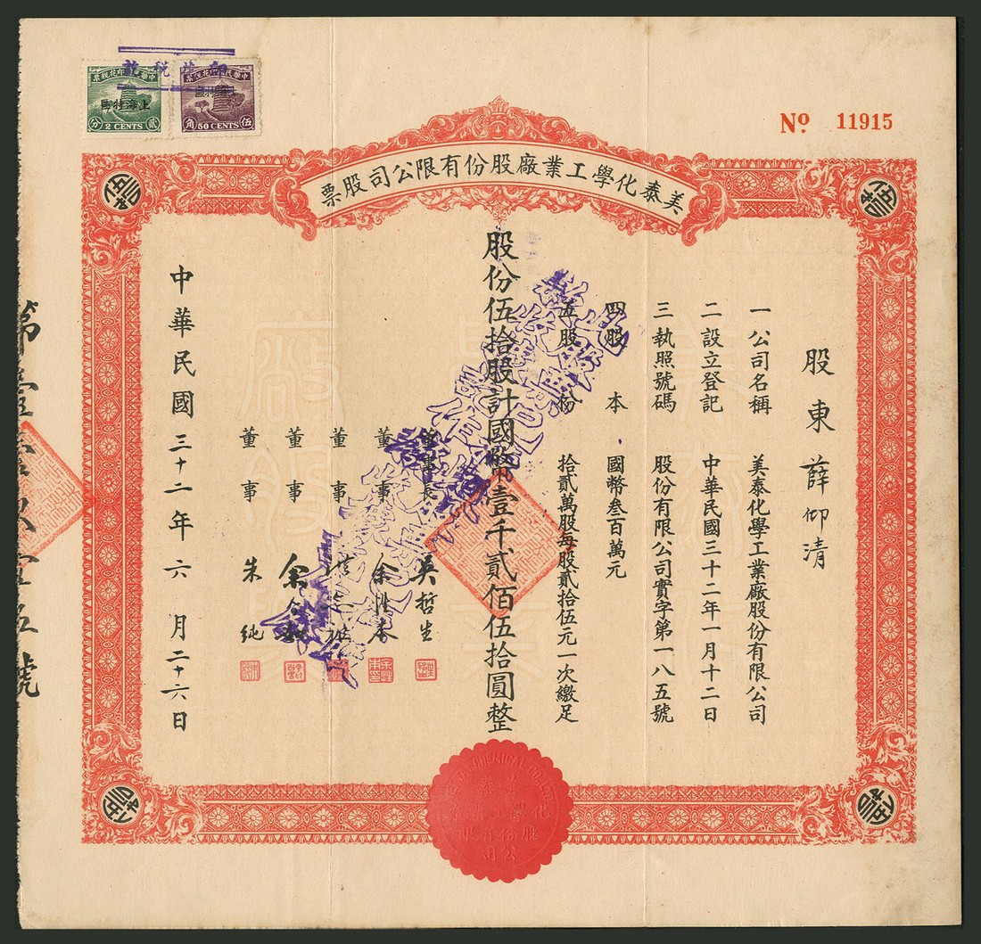 Mei Tai Chemical Co. Ltd., a group of 3 certificates for 1 share, no.1586, 10 shares, no.7549 and 50 shares, no.11915 of 25 yuan, 1943, ornate borders, brown, green and red respectively, text all in Chinese with company name in English in the embossed seal, adhesive revenue stamps, very fine and better. (3)