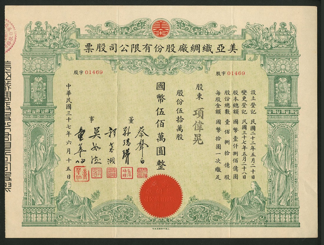Mei Ya Weaving Mill Co. Ltd., 500,000 shares of 10 yuan, 1948, no.01469, very ornate border with several robed females either seated or standing, green, red and black, text all in Chinese, good very fine.
