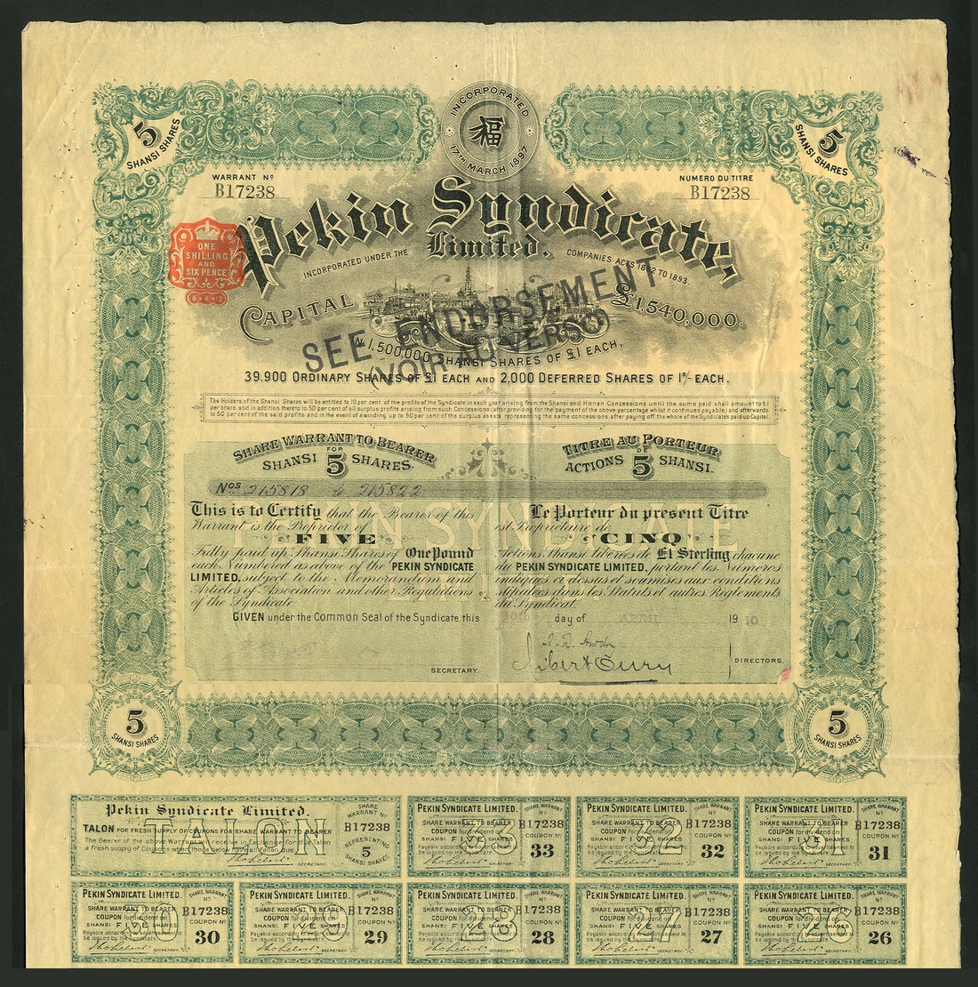 Pekin Syndicate Limited, bearer warrant for 5 shansi shares of £1 each, 19(10), no.B17238, large format piece with vignette in centre of railway and city view, ornate border, green and black on yellow paper, text in English and French, with coupons, small ink mark in right margin, very fine.