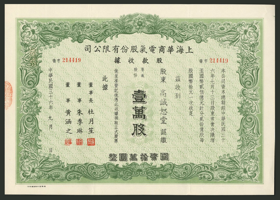 Shanghai Chinese Electric Co. Ltd., 10,000 shares of 10 yuan, 1947, no.214419, ornate border, green and black, text all in Chinese, extremely fine.
