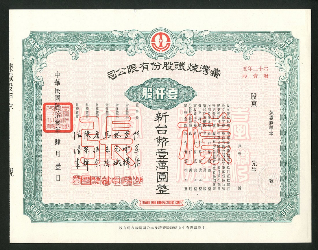 Taiwan Iron Manufacturing Corporation, unissued certificate for 1000 shares of 10 yuan, 1974, ornate border, green and red with pink underprint, with counterfoil extremely fine