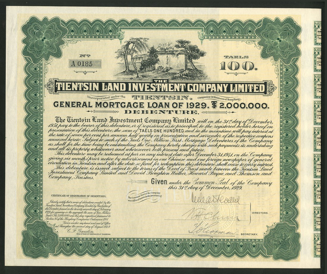 Tientsin Land Investment Co. Ltd., general mortgage loan of 1929, 100 tael debenture, no.A0185, vignette of shrine, ornate border, green and black, yellow underprint, printed by Waterlow & Sons, with coupons, about extremely fine