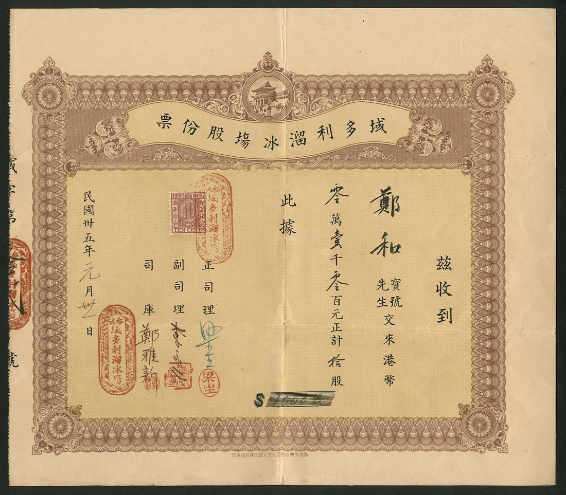 Victoria Skating Company, $100 shares, 1946, ornate border with small building at centre top, brown, yellow underprint, Hong Kong adhesive revenue stamp, very fine.