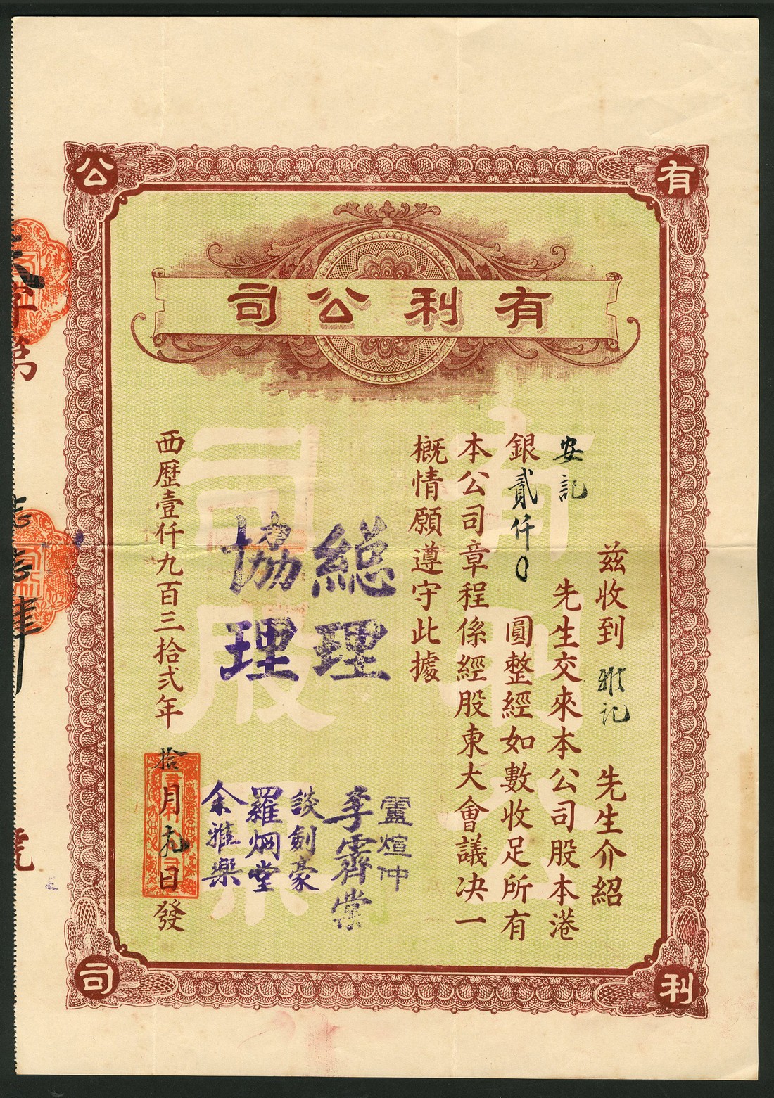 You Lee Company, $100 preference shares, 1932, ornate border, red-brown with pale green underprint, text all in Chinese, very fine.