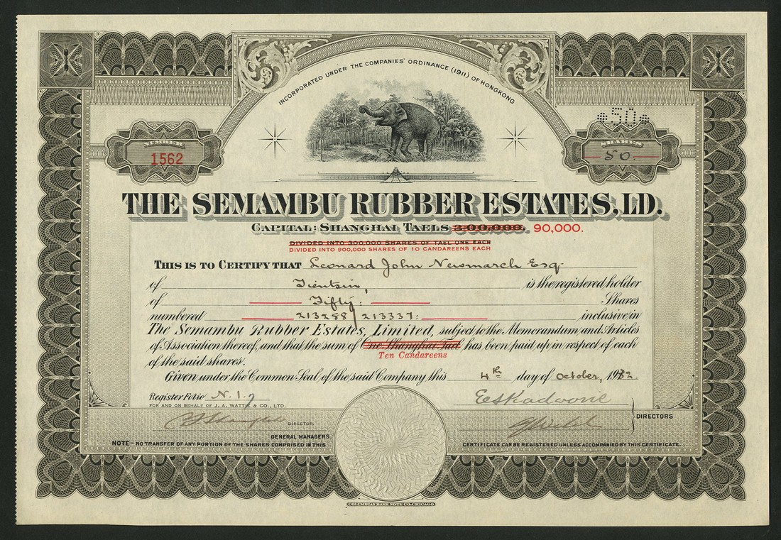 Semambu Rubber Estates, Ltd., 10 candareen shares, 191[32], no.1562, capital restructure overprinted in red, signed by E. Kadoorie, vignette of elephant top centre, brown and black, printed by the Columbian Banknote Co., extremely fine.