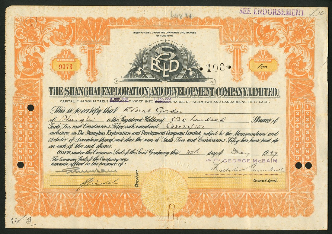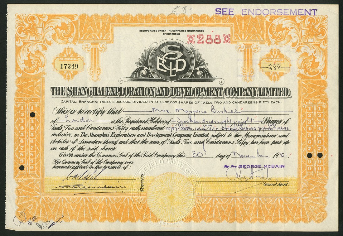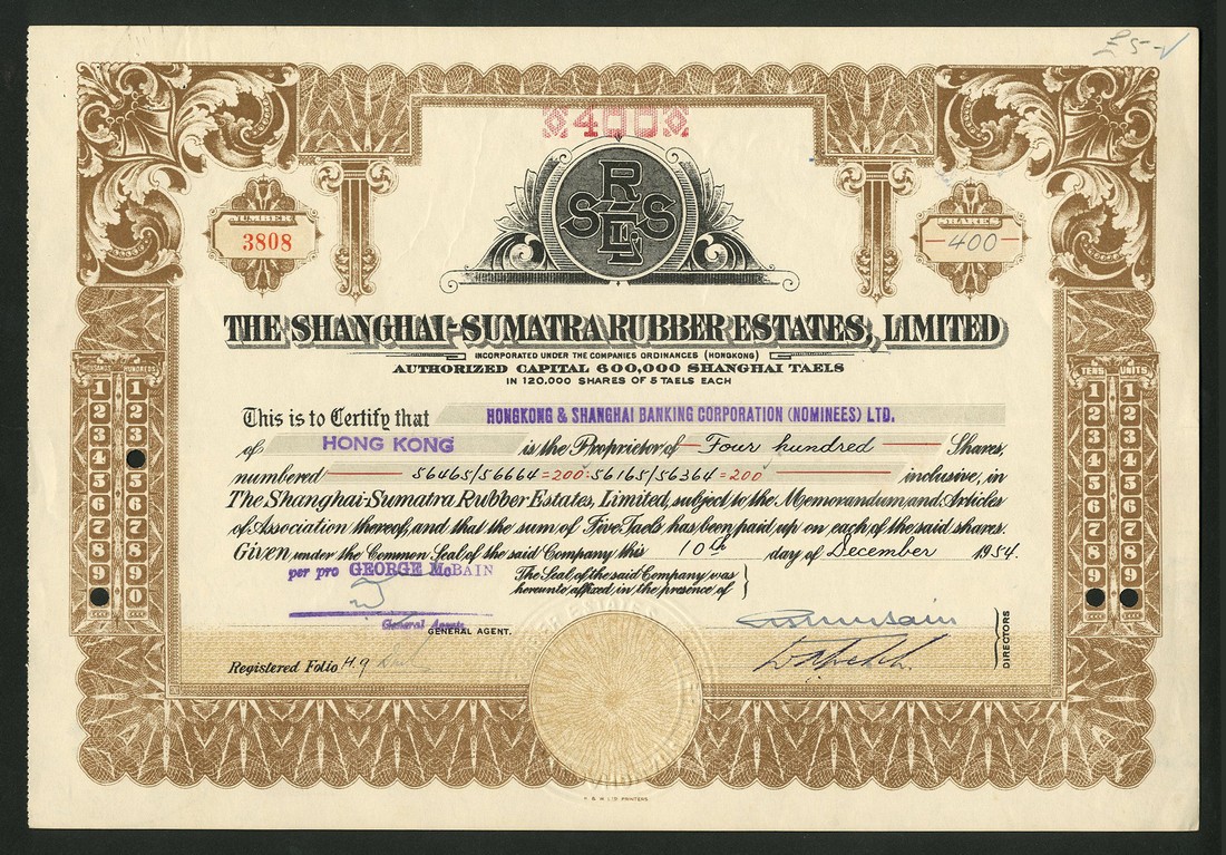 Shanghai Companies in Malaya: a group comprising Shanghai Kelantan Rubber Estates (1925) Ltd., 10 cent shares, 19[40], no.A3489; Shanghai-Sumatra Rubber Estates Ltd., 5 tael shares, 19[54], no.3808, and Shanghai Exploration and Development Co. Ltd., 2 tael 50 candareen shares, 19[39] and 19[51], the first with verprinted capital, about very fine and better. (4)