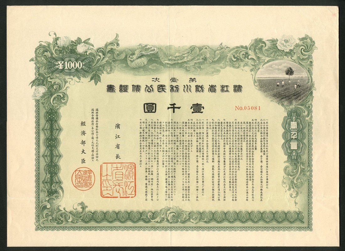 Imperial Manchurian Government, Flood Control Loan, bond for 1000 yen, attractive design with dragon at top, workers in field at top right, green and black, with coupons, good very fine and scarce.