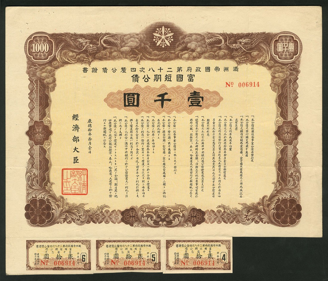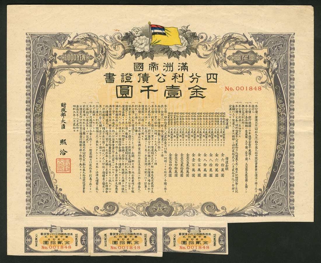 Imperial Manchurian Government, Public Loan 4%, bond for 1000 yen, Kotoku 1 (Showa 9; 1934), flag at top, ornate border, grey and yellow, with coupons; together with 4% Public loan, 1943, ornate border, brown and black, with coupons, both very fine. (2)