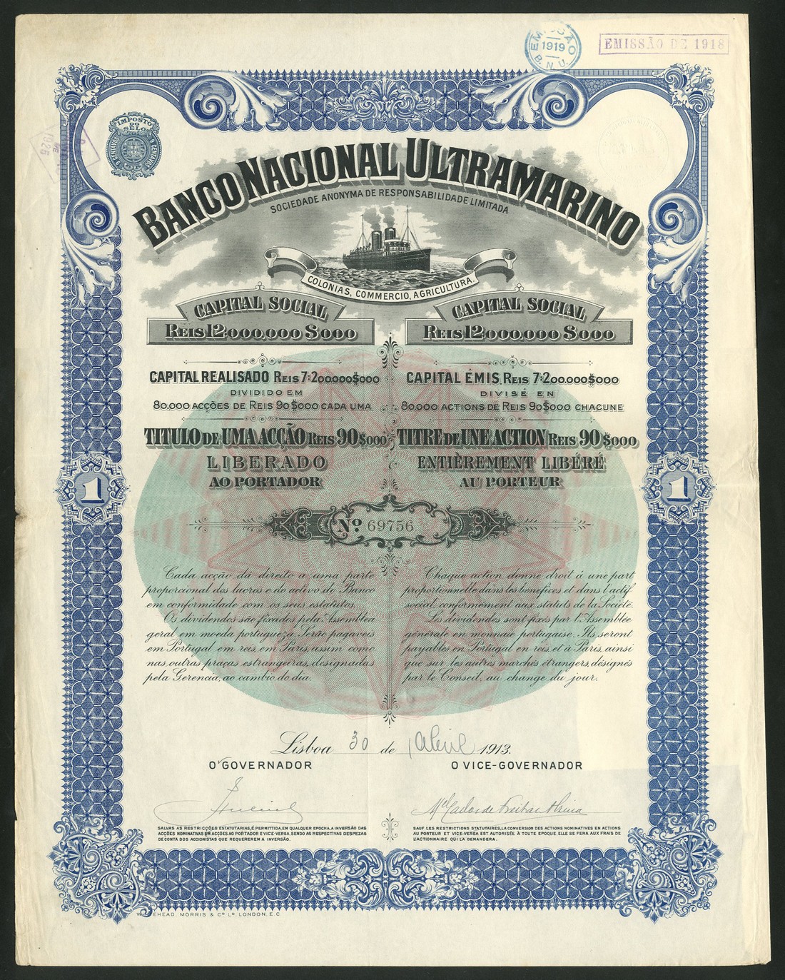 Banco Nacional Ultramarino, one share of 90 reis, Lisbn 1913, no.69756, large format piece with vignette of steamship at top, ornate borders, text in Portusguese and French, blue and black, with coupons, good very fine.