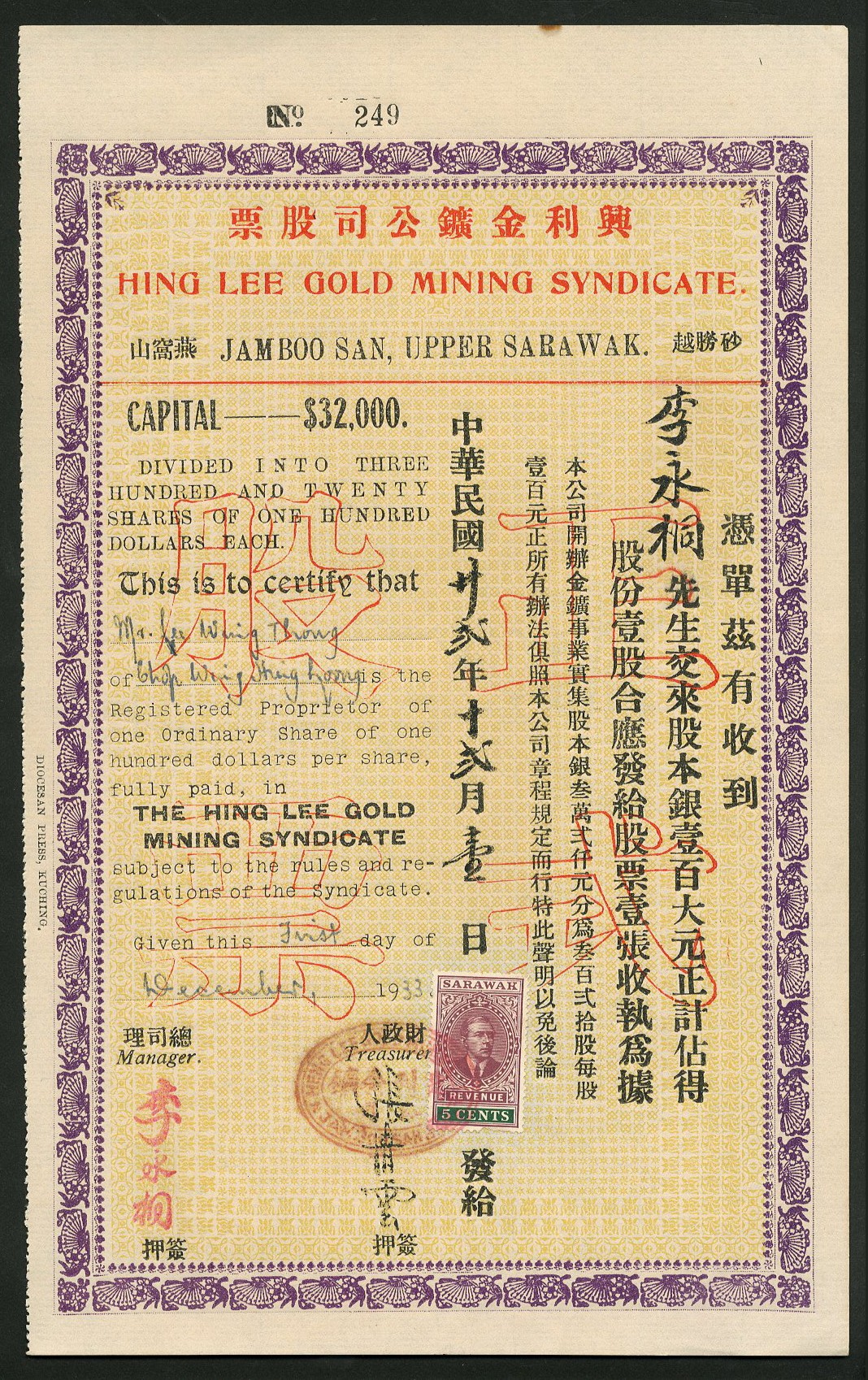 Sarawak: Hing Lee Gold Mining Syndicate, Jamboo San, Upper Sarawak, 100 dollar share, 19[33], no.249, ornate border, black and mauve with yellow underprint, text in English and Chinese, Rajah Brooke adhesive revenue stamp, printed in Kuching, extremely fine and extremely rare.