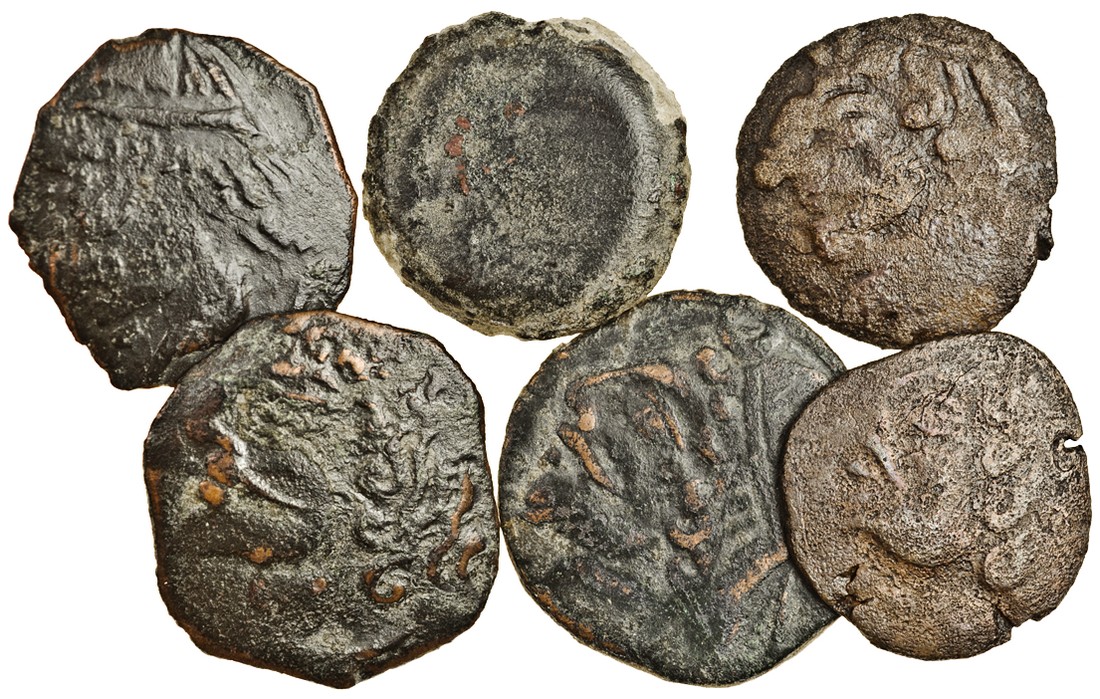 Central Asia, Early Chach / Kangchu (c.3rd - 6th century), small AE Drachms (6), diademed bust left, rev. swan-shaped tamgha surrounded by legend (SK 1-2-2, 1-2-3, 1-3-1, 1-3-2 (2), unlisted type), fine to very fine (6)