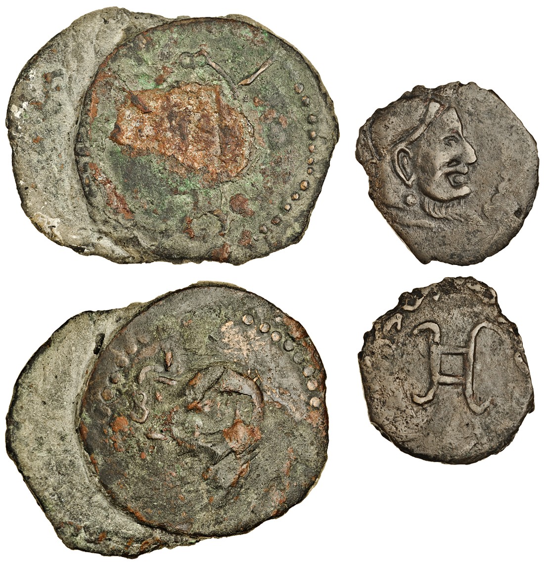 Central Asia, Chach / Benakan (c.7th -8th century), AE Drachms (3), diademed and bearded bust right, front-facing bust wearing a helmet with lunar headdress (2 coins adhering together as found), rev. tamgha (SK 4-1-1, 4-2-1), about very fine and fair (3)