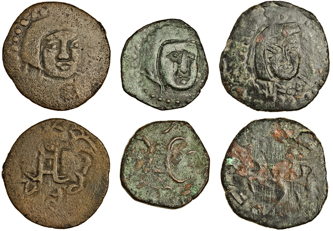 Central Asia, Chach / Benakan (c.7th -8th century), AE Drachms (3), bust facing three-quarters right, wearing a tightly-fitting helmet or hood, rev. tamgha surrounded by legend (SK unpublished type, 4-4-5 (plate coin 166), 4-4-5 var), very fine / fine (3)