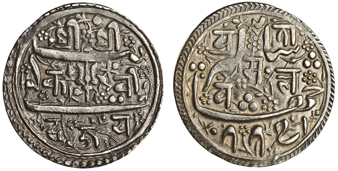 Nepal, Kathmandu, Pratap Malla (1641-74), Mohar, NS 775 (1655), modelled on contemporary Mughal coinage, Newari legend around trisul between Persian letters, Sri Sri Kavindra Jaya, rev. Newari legend, Pratapa Malla 775 between Persian legend reading 'Jahangir Shah' (RGV.260; KM.164), about very fine